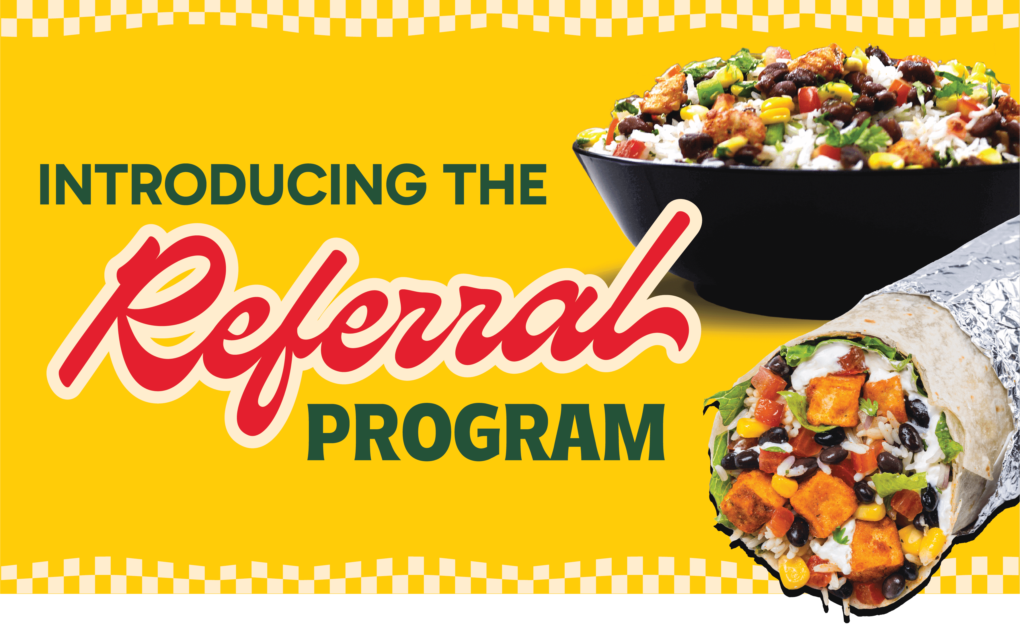 It is our exclusive referral program which incentivizes you with Flat Rs. 100/- off per successful referral made by an existing customer. Whereas, your friend gets a free mini Bowl or a free mini Burrito in store upon successful purchase.